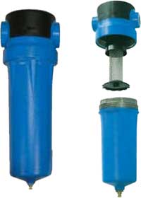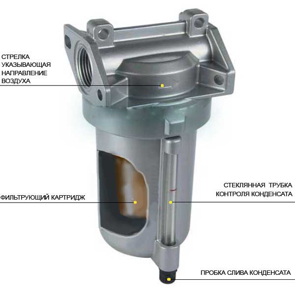 Конструкция влагомаслоотделительного фильтра достаточно проста. Он состоит из разборной колбы, с закрепленным внутри фильтрующим картриджем, и клапаном слива конденсата. Корпус фильтра изготавливается из алюминия или пластика. Материалами изготовления фильтрующего картриджа могут быть разнообразные сплавы и пластичные волокна, а также керамика.